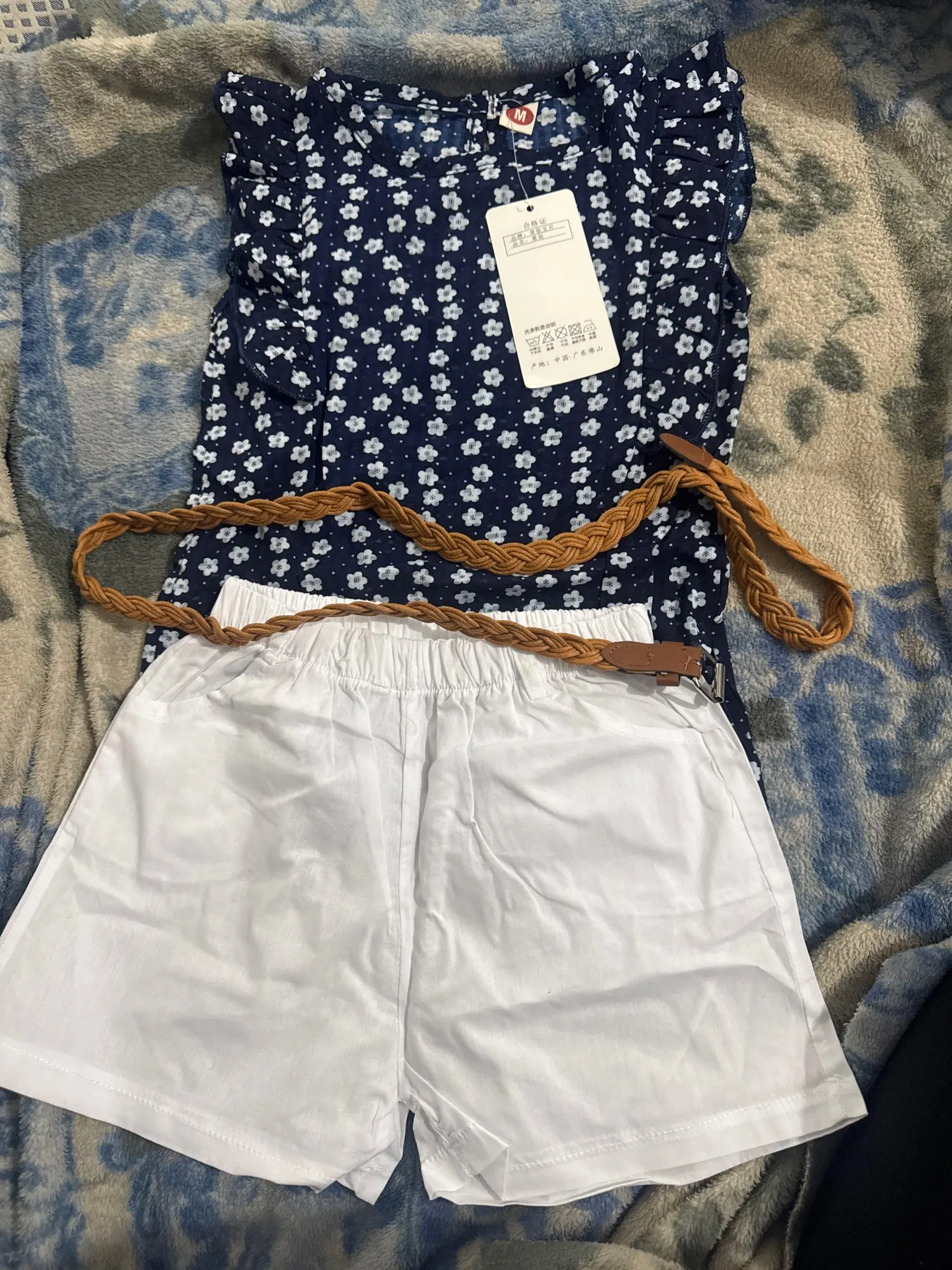 Summer Children Girl Floral Print Sleeveless Set Toddler Outfit T-shirt Shorts Pants With Belt Kids Girls Clothing –